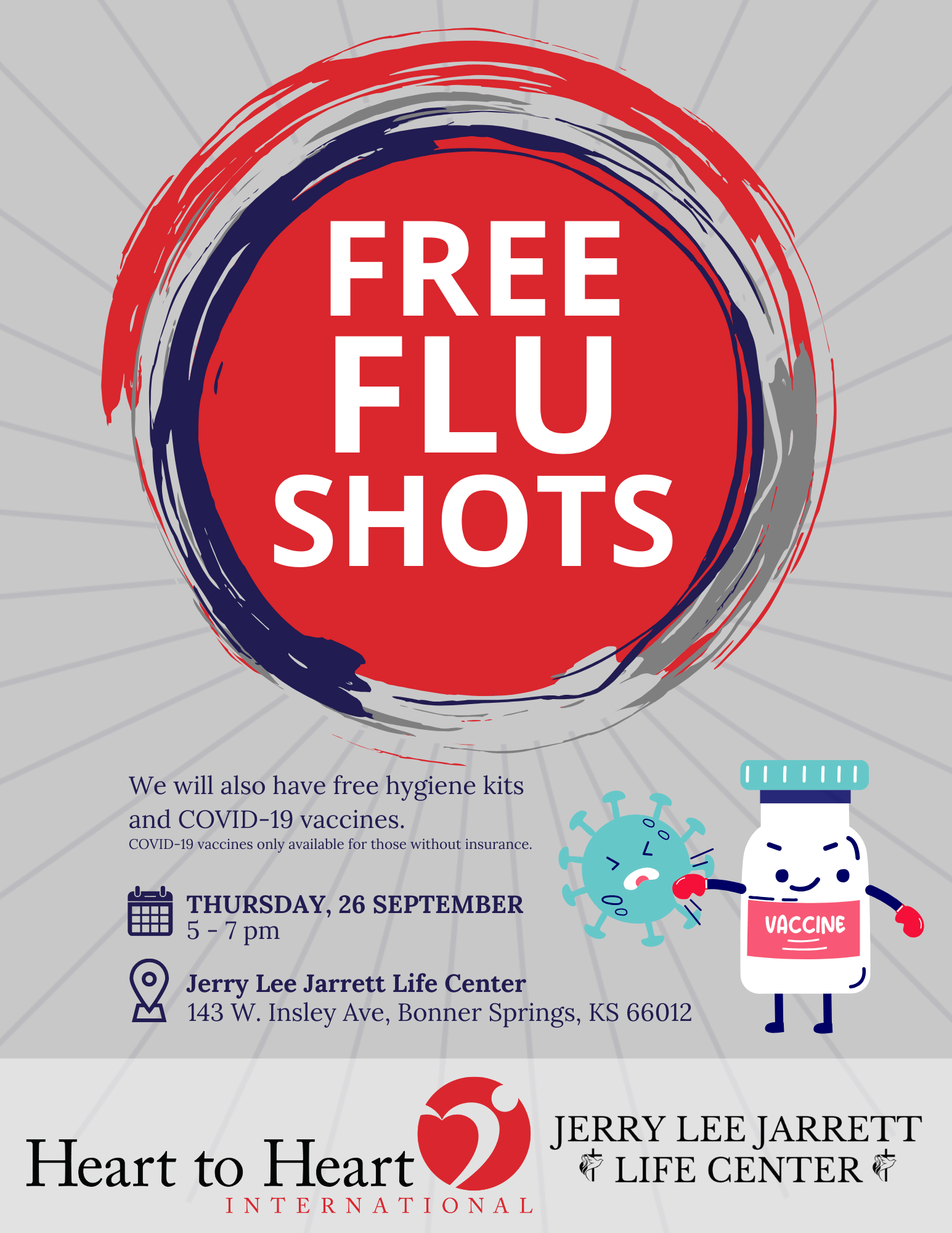 Jerry Lee Jarrett Life Center Flu Shot Clinic We will be offering flu vaccines during the cooking class held at this center. Location: Jerry Lee Jarrett Life Center Address: 143 W Insley Ave., Bonner Springs, KS 66012 Partners: MARC, JLJLC The event is finished. Date Sep 26 2024 Expired! Time 5:00 pm - 7:00 pm Local Time Timezone: America/New_York Date: Sep 26 2024 Time: 6:00 pm - 8:00 pm Location Christ First Ministries Christ First Ministries Category COVID-19 Vaccines Flu Vaccines Share this event