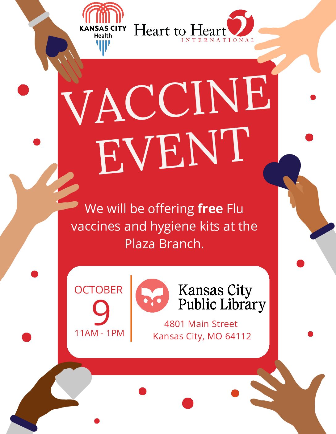 KCPL Vaccination Event We will be offering free flu shots and hygiene kits! Location: Kansas City Public Library – Plaza Branch Address: 4801 Main Street, Kansas City, MO 64112 Partners: KCPL, KCMO HD The event is finished. Date Oct 09 2024 Expired! Time 11:00 am - 1:00 pm Local Time Timezone: America/New_York Date: Oct 09 2024 Time: 12:00 pm - 2:00 pm Location Kansas City Public Library - Plaza Branch 4801 Main St, Kansas City, MO 64112 Category Flu Vaccines Hygiene Kits Share this event