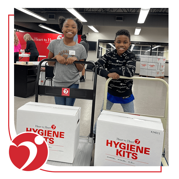 Hygiene kits with soap, shampoo, toothbrushes, and other essentials